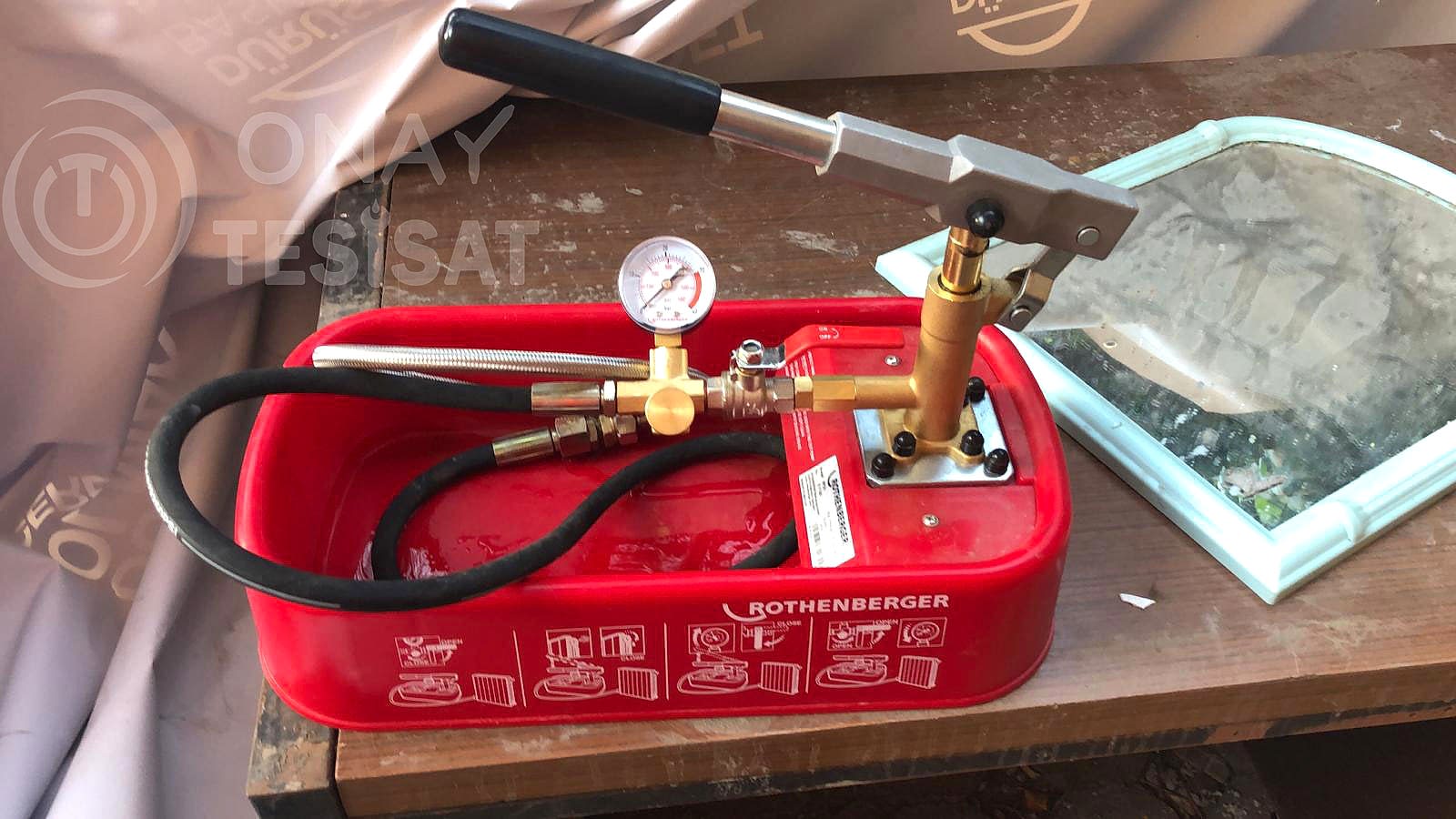 Su tesisatını basınçlandırmak için kendimize tesisatınızda bir giriş noktası belirliyor, tesisatın içerisindeki havayı alıyor ve vanalar kapalı konumda iken Rothenberger marka basınçlandırma test pompamız ile tesisatınızdaki suya basınç kuvveti uyguluyoruz.